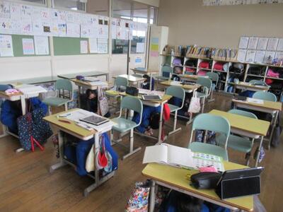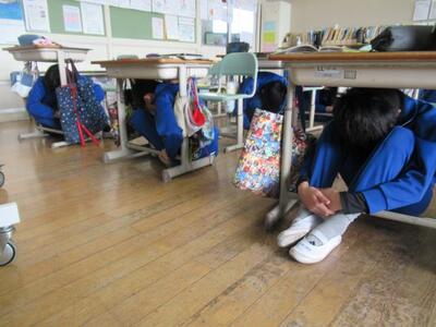 11時にJアラート(全国瞬時警報システム)の訓練用防災無線が入りました。このJアラートの訓練用防災無線は、年に数回実施されています。これは、平成29年に、北朝鮮による中距離弾道ミサイルが発射されたことを受け、万が一の時にどう対応するかについて訓練を重ねてきました。子ども達は、無言でスムーズに窓から離れ、机の下に入り、頭部を守りました。