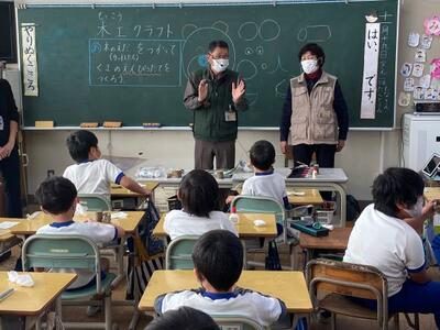 福島県林業振興課では、子ども達が 森林の大切さや木材に対する理解の向上を図ることを目的に、小・中学校を対象に木工工作等用資材の提供及び出前講座を開催しています。この日は、1年生が出前授業をしていただきました。