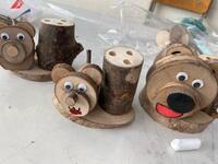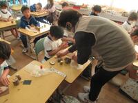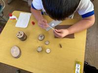 テーマは、「木の枝を使って、くまのえんぴつたてをつくろう。」でした。準備していただいた、木の枝を組み合わせながら、木工ボンドで接着して形にしました。