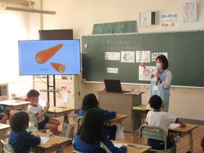 2年生は、中村第一中学校の丹先生にお世話になりました。2年生のテーマは、「野菜を食べるとどんないいことがあるのか。」でした。4つのいいことを教えていただきました。