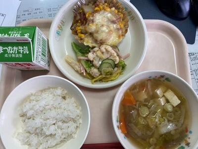○麦ごはん ○里芋のチーズ焼き ○カリフラワーサラダ ○具だくさん味噌汁 ○牛乳