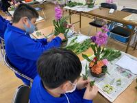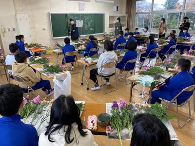 JAふくしま未来様の支援事業の一環として、6年生が生け花教室を実施していただきました。この日準備していただいた花は、「カーネーション」「レザーファン」「ストック」の3種類でした。はじめに、JAの担当の方から「ストック」について、属性や品種、色ごとの花言葉などを教えていただきました。実習は、「池坊」教室から3名の方々がご来校して教えていただきました。
