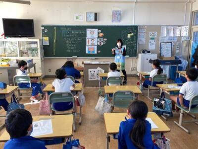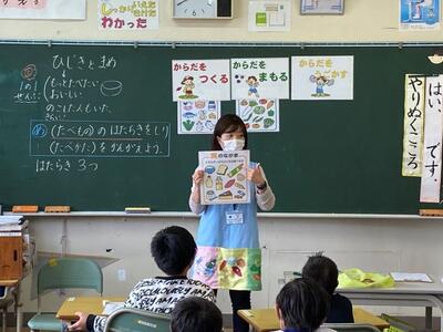 栄養教室2番手は、4年生でした。4年生は、新地小学校の福山桂子先生にお世話になりました。4年生は、生活習慣病予防のための食事のとり方について教えていただきました。はじめに、「自分手帳」の食生活の質問に答えながら、日頃の食生活について振り返り、改善のめあてを決めました。そして、将来にわたって健康な体でいるための食生活の基本を教えていただきました。