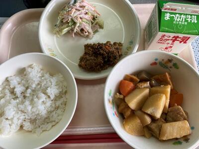 相馬市の防災備蓄倉庫の食料を更新するために、給食でサバ缶を利用しました。サバ缶は、小松菜と合わせてふりかけにして提供しました。また、3年生が大野農園の菊池様にお世話になりながら育ててきた、土垂いもも提供しました。土垂いもは、豚肉と大根と一緒に煮つけになりました。