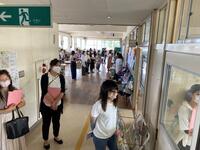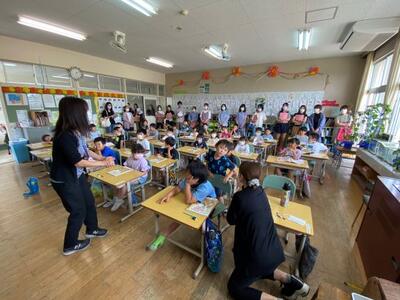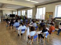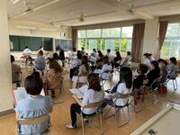 小学校では、午後から授業参観と学年懇談を、感染症対策を工夫して行いました。今回ご協力いただいた感染症対策は、上学年と下学年時間差実施、各家庭1名限定、受付で検温・記名・手指消毒、広い部屋に移動しての学年懇談会実施でした。