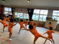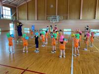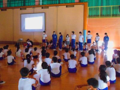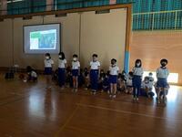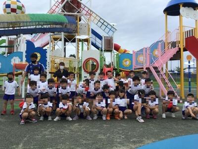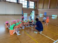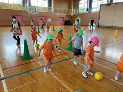 はじめに、準備運動として軽く体を動かしました。次に、体の周り・足の周り・首の周りなどをボールを落とさないように回しました。そして、いよいよ足を使っての練習です。ボールの上を飛び越えたり左右のつま先をタッチしたりました。ドリブル練習では、優しくボールを扱うことやボールの先回りをしてボールを止めることを教わりました。少しずつボールの扱いが慣れてきたころに、カラーコーンの間を通したりカラーコーンに当てたりして、ゲーム感覚で楽しみました。最後は、チームに分かれてゲームをしました。全員気持ちではサッカー選手になりきり、必死にボールを追いかけました。