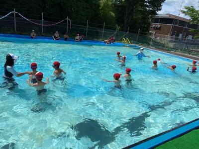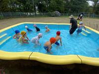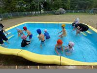 今日は、絶好のプール日和。そして、チューリップ組さんにとっては、幼稚園初めてのプール活動でした。念入りに水慣れをして、徐々に水の中へ!ダイビングおもちゃを拾ったり、ワニ歩きをしたりながら全身を水の中へ!仕上げは、ワニ歩きをしながらの輪くぐりです。30分間全力で楽しみました。