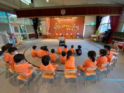 いました。ハンドベル演奏です。「きらきら星・たなばたさま・カエルの歌」の3曲大サービスでした。演奏後には、園児たちから「先生たち上手」の声が上がりました。