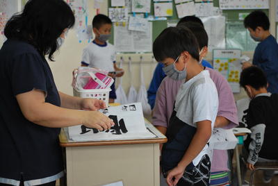 書写の時間は、分科の先生と。とめ、はね等、ポイントを教えていただいて、きれいな文字を書くために頑張っています。
