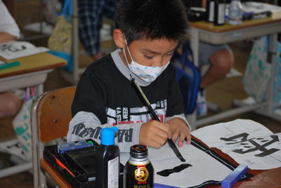 姿勢よく、習字に取り組んでいます。「一画目、いい感じで書けた。次も特徴を捉えて」