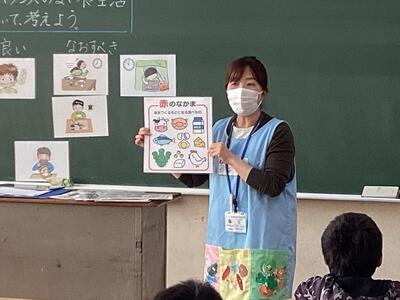 2022年11月21日 15時28分4年生は、中村第一中学校 櫻井有希乃 栄養教諭に、「ふくしまっ子栄養教室」をしていただきました。4年生の授業テーマは、9月に行った生活習慣病健診に関連させ、「生活習慣を予防する食習慣」です。このテーマに迫るため、『バランスの良い食生活』についてみんなで考えました。ある小学4年生の食生活から、バランスの良い食生活とは、赤・黄・緑の栄養バランスを考えて食べること。特に緑の野菜は、一日に300ℊ食べることを学びました。また、おやつを食べる時間・量・種類についても考える必要があることをも教わりました。