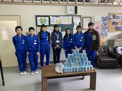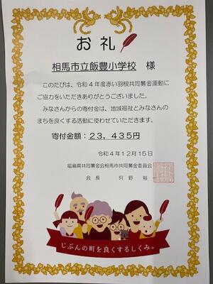 2022年12月21日 09時26分児童会の計画委員会が中心となって、おなじみのドラえもん募金箱を使って今年度も赤い羽根共同募金を行ってきました。この日は、相馬市の社会福祉協議会の担当の方にご来校いただき、集めた募金を贈呈しました。
