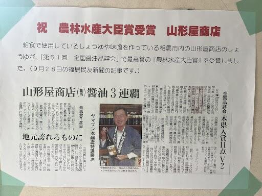 給食でもお世話になっている相馬市の山形屋さんのお醤油が全国醤油品評会で最高賞の農林水産大臣賞を受賞しました。しかも3連覇だそうです!!
