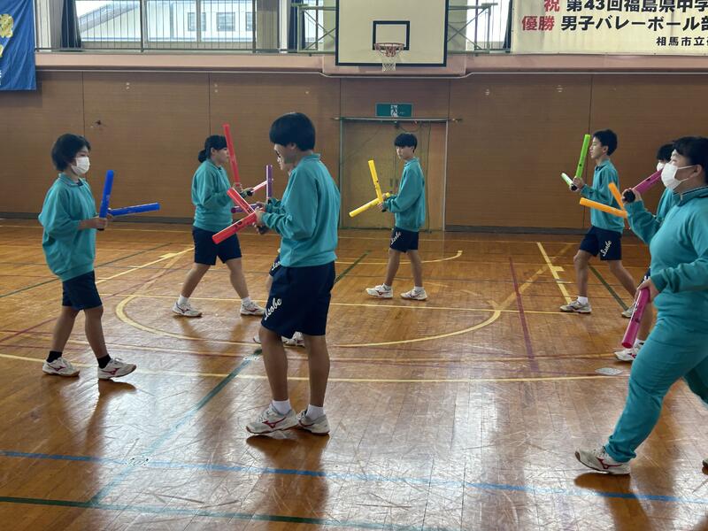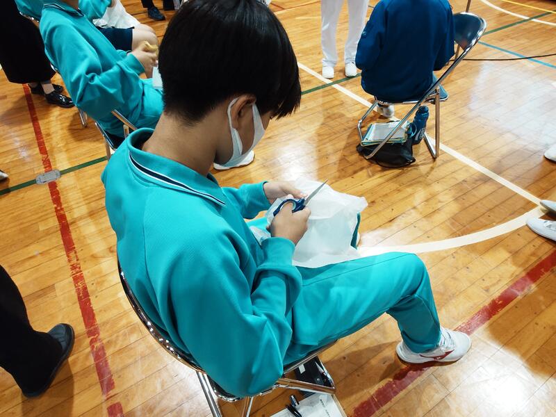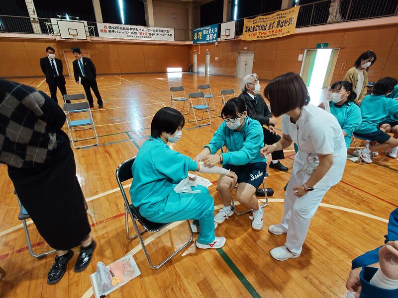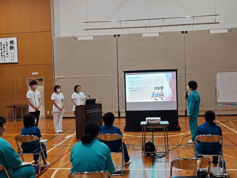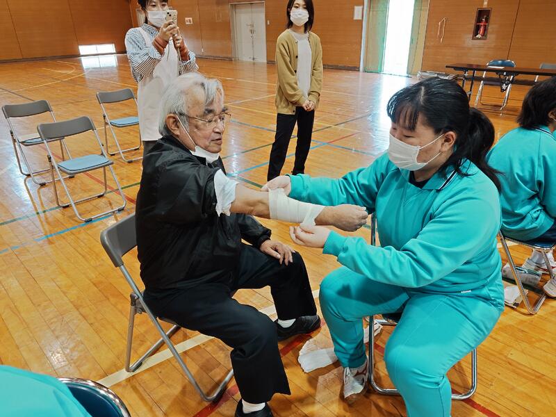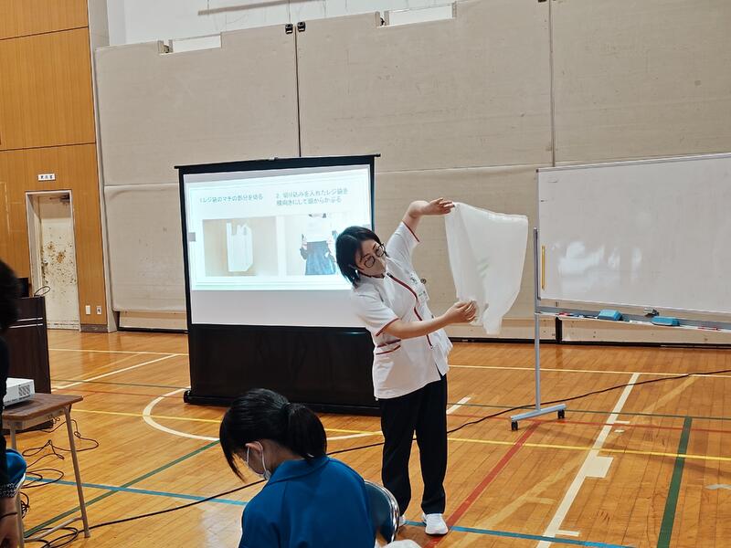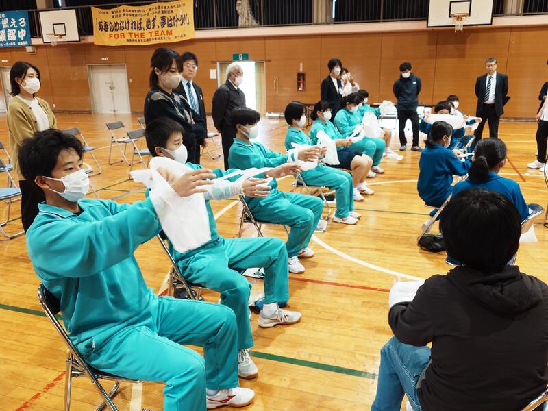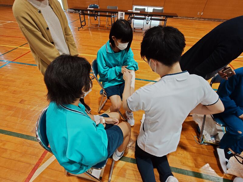 公立相馬総合病院から4名の講師の先生にお越しいただき、運動中や不慮の事故等で起こった骨折やけがによる出血への対応などについて学ぶことができました。また、レジ袋を三角巾代わりに使う方法や包帯の巻き方などを教えていただき、実際にチャレンジしてみました。