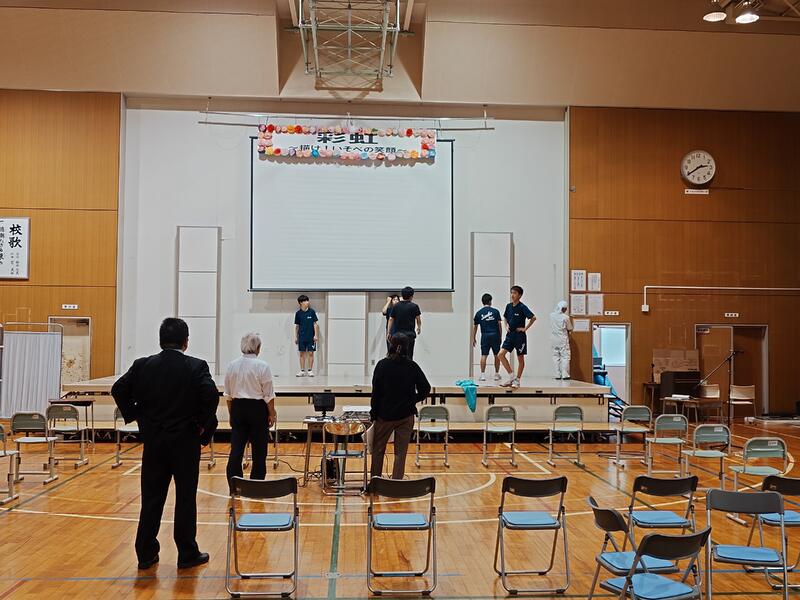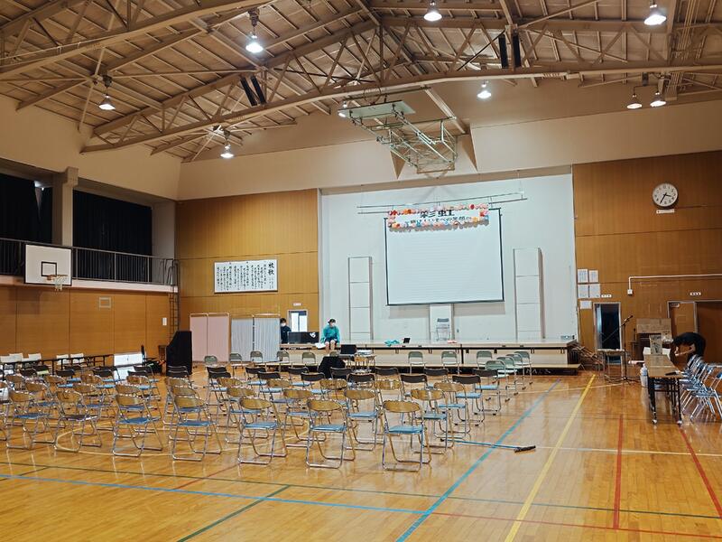 小学校と合同になるので、昨年より座席数を多めに。そして、黒潮祭の看板を『波潮祭』に。結構やることはたくさんあります...。明日はリハーサルの日なので、会場のセッティングは本番同様にする必要があります。子どもたちも先生たちもフル稼働! 小学生も体育館のステージ上で初めて練習しました。