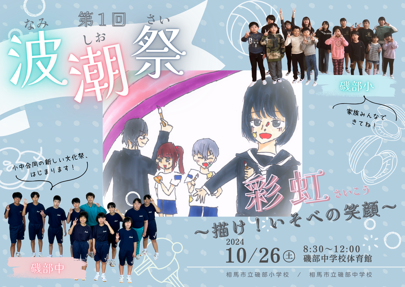 小学校の学習発表会、中学校の文化祭を1つにし、小中合同の行事とした初の試みである『第1回波潮祭』が開催されました。『彩虹(さいこう) ~描け!いそべの笑顔~』のテーマどおり、小学生、中学生、保護者の方々、地域の方々、先生たちの笑顔いっぱいのすばらしい文化祭となりました。