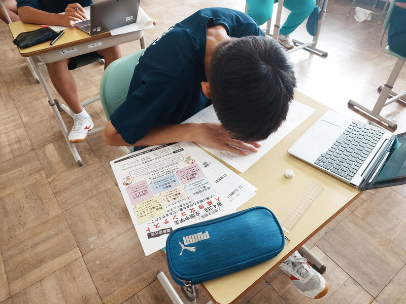 中学校に戻り、人権作文に取り組みました。子どもたちは日常の学校生活などでの経験や体験をもとに、人権尊重の大切さについて、自分なりの考えをまとめていました。