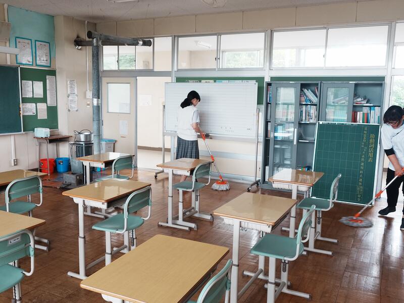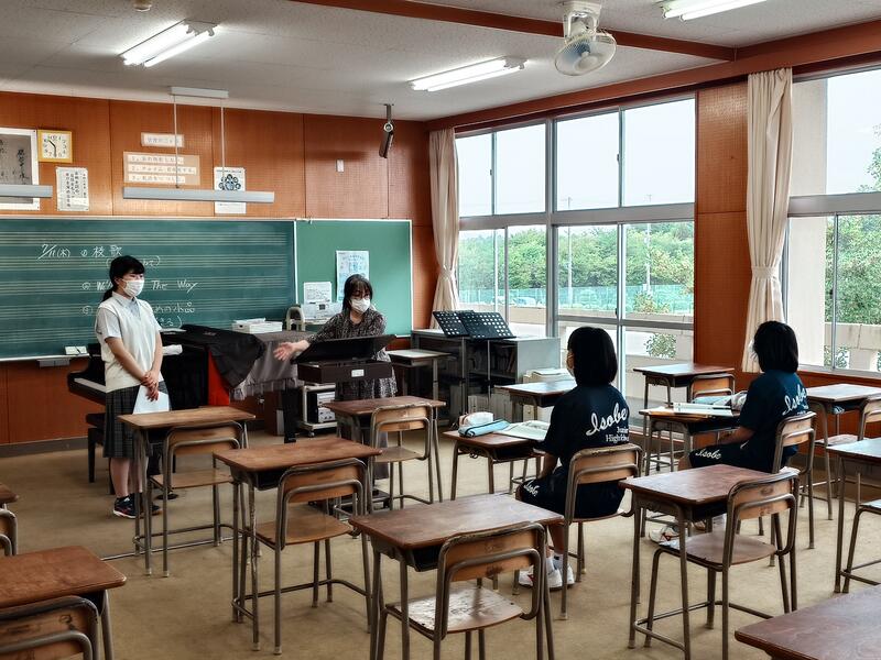 生徒数の少ない学校だと、子どもたちや先生方が精一杯がんばっても、校舎内の清掃や物品の整理になかなか手が回りません。自分たちが授業を受けているときに、スクール・サポート・スタッフの馬場さんがどのような仕事をしていたのか実際に見て、体験してもらいました。また、1年生の音楽では、ピアノ伴奏などで授業の補助をしてもらいました。