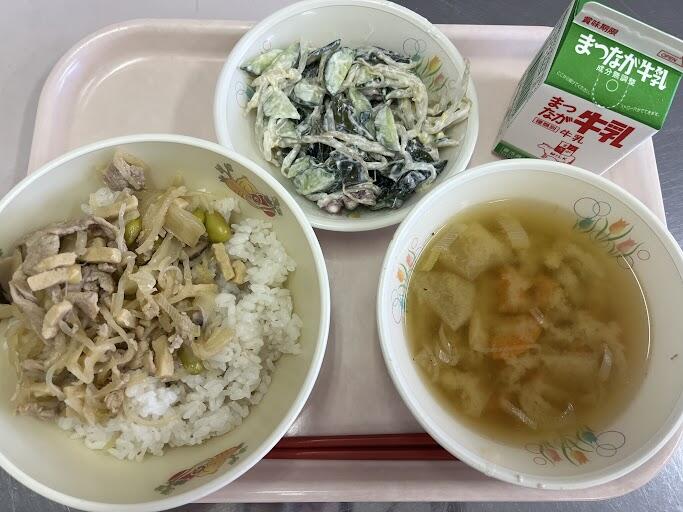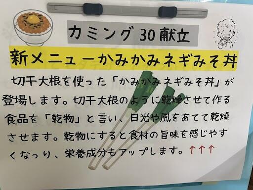 そして月曜日は学校訪問があり、生徒の人数よりも多くのお客様が来校されて、給食も召し上がりました たこが給食で出るのは相馬ぐらいだそうですよ 新メニューのかみかみネギ味噌丼には、切り干し大根がたくさん入っていました。