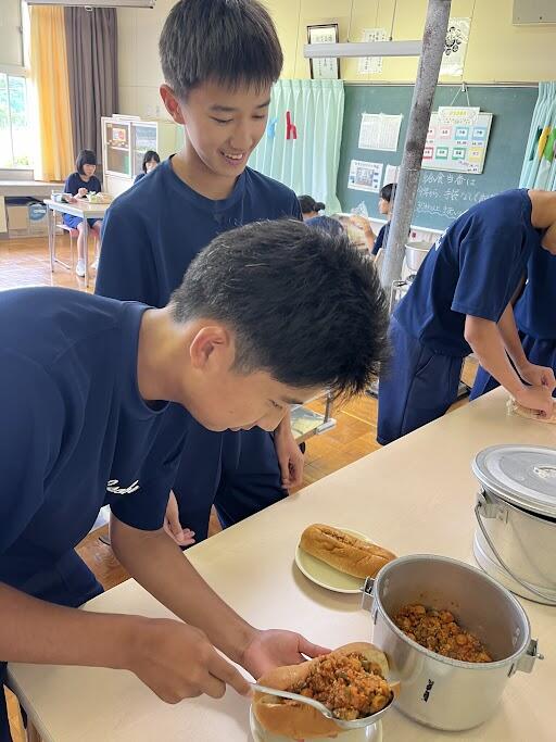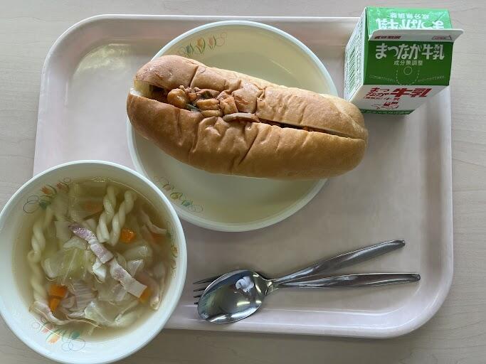 水曜日は麺、木曜日はパン!! 木曜のこつぶ入りチリコンカンには、こつぶあげという、小さいがんもの様なものが入っていました。チリコンカンは給食室で一つ一つ調理員さんがパンにはさんでくださいました。