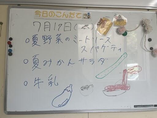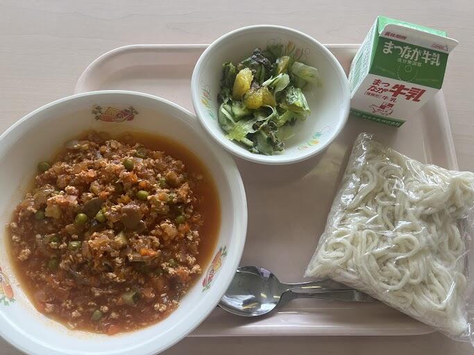 水曜日の麺の日は、野菜たっぷりの夏野菜ミートソーススパゲッティーでした。ズッキーニ・なす・トマトなどの夏野菜がたっぷり!