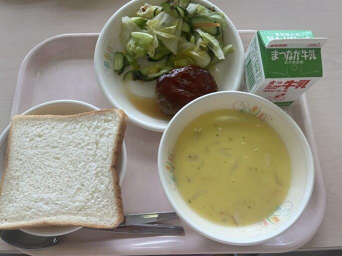 最終日は食パン・ハンバーグ・グリーンサラダ・かぼちゃのポタージュでした。かぼちゃは緑黄色野菜で栄養満点。スープにごろごろ入っていて食べ応えも十分でした