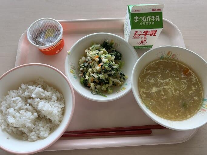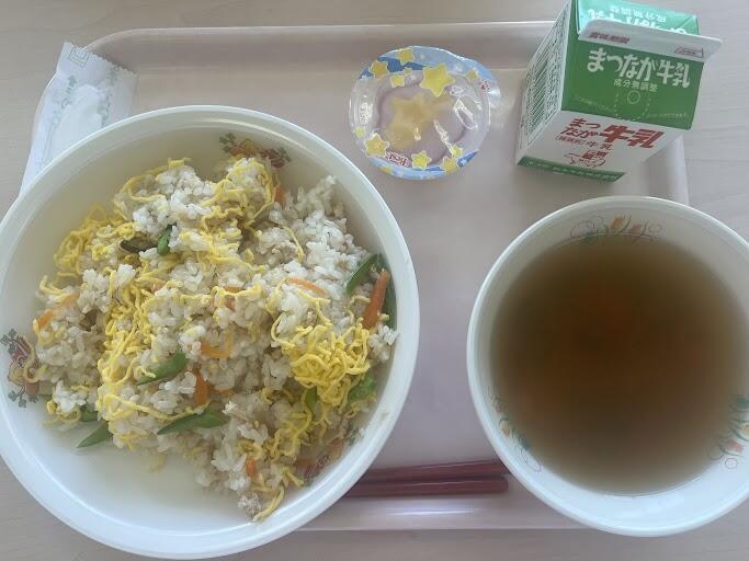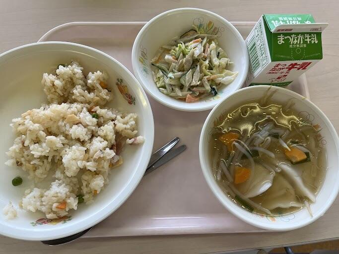 メニュー 焼豚チャーハン 水餃子のスープ ごぼうサラダ 牛乳