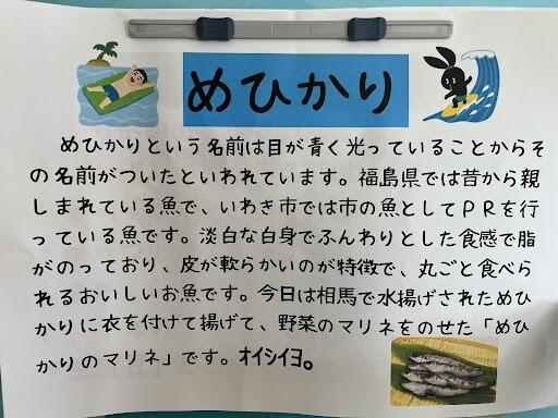 福島県いわき市でとれた目光のマリネは、丸揚げしていたため、骨まで食べることが出来て栄養満点マリネでたべるとさっぱりとして、暑い日にぴったりでした。