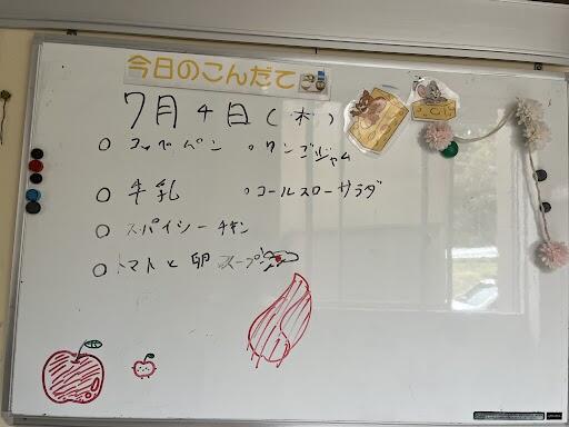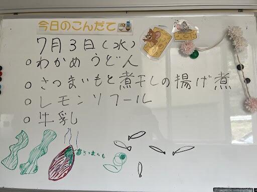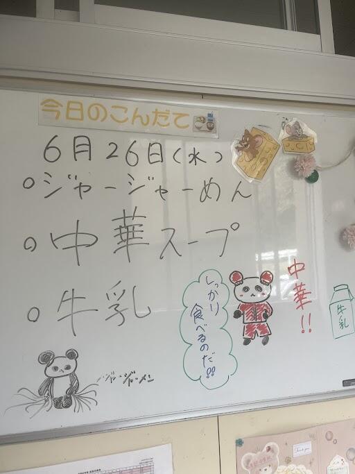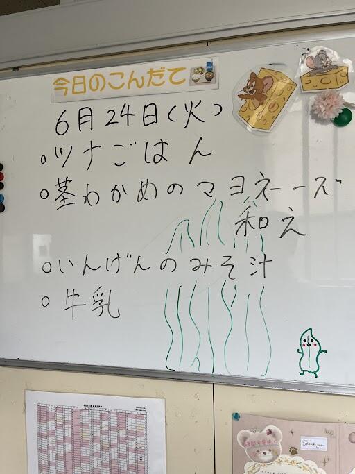 そして金曜日、本日の給食は七夕メニューでした。保健委員会がメニューを書いてくれるホワイトボードにも素敵なメッセージが