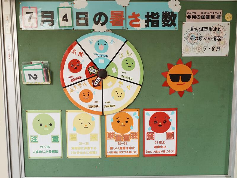 今年度も熱中症事故防止のため、環境省熱中症予防情報サイト等から最新の情報を確認したり、活動前に活動場所の「暑さ指数」を計測し、一定の基準を超えた場合には活動場所を変更、もしくは活動自体を中止したりするようにしています。また、子どもたちが自ら熱中症の危険を予測し、自分の身を守る行動をとれるように指導をしているところです。