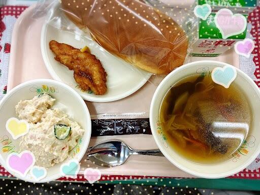 1月11日 コッペパン パテチョコレート 白菜とわかめのスープ ささみのレモン漬け ツナポテトサラダ 牛乳