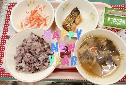 1月12日 お正月献立 紫黒米ご飯 紅白なます 鰆の西京焼き 白玉入り雑煮 牛乳