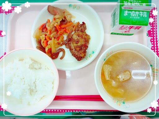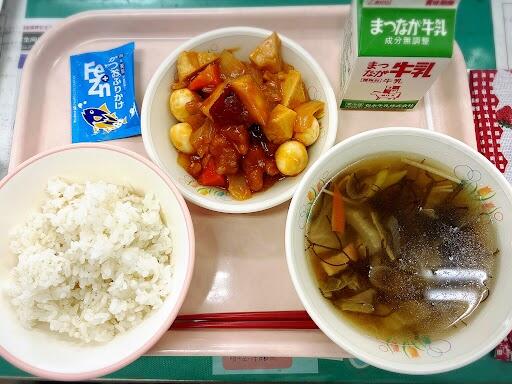 15日 麦ご飯 かつおふりかけ もずくスープ 酢鶏 牛乳