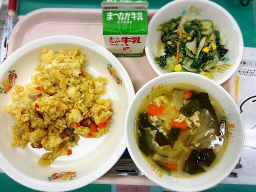 16日 カレーピラフ ポパイサラダ ふわふわたまごスープ 牛乳