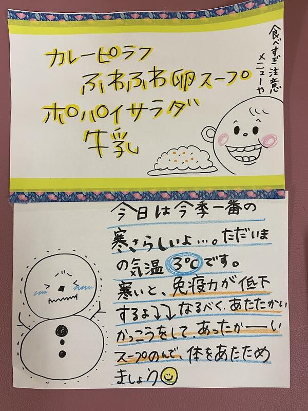 あたたかい格好をして、あたたかい食事をしっかり食べて体を温め、ウイルスに負けないように! ウイルスに嫌われるように! 免疫力高めていきましょう!