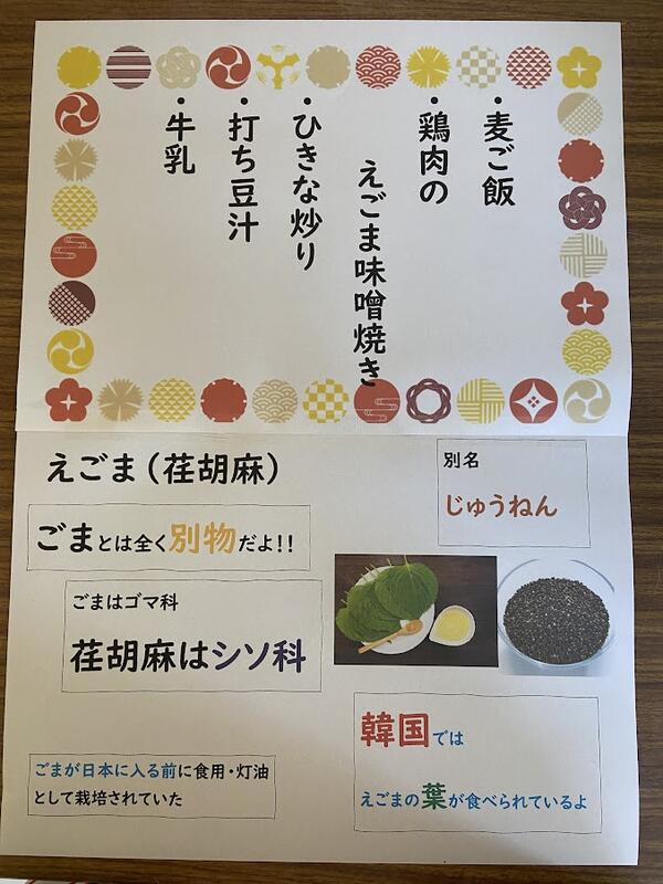 「じゅうねんみそ焼き」 団子などについているじゅうねんのたれとは違って、すりつぶしていないじゅうねんが入ったじゅうねんみそ。 子ども達の食べた感想 「ぷちぷちしてる」 「初めて食べた」 「おいしかった」 「・・・まずくはない」 校長先生の感想 「マスタードかと思ったら、じゅうねんだった」 |
