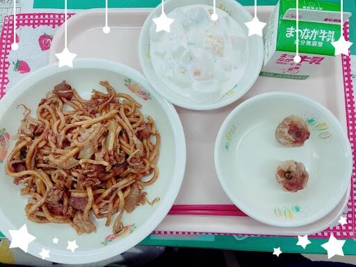 24日 なみえ焼きそば 揚げシュウマイ フルーツヨーグルト和え 牛乳