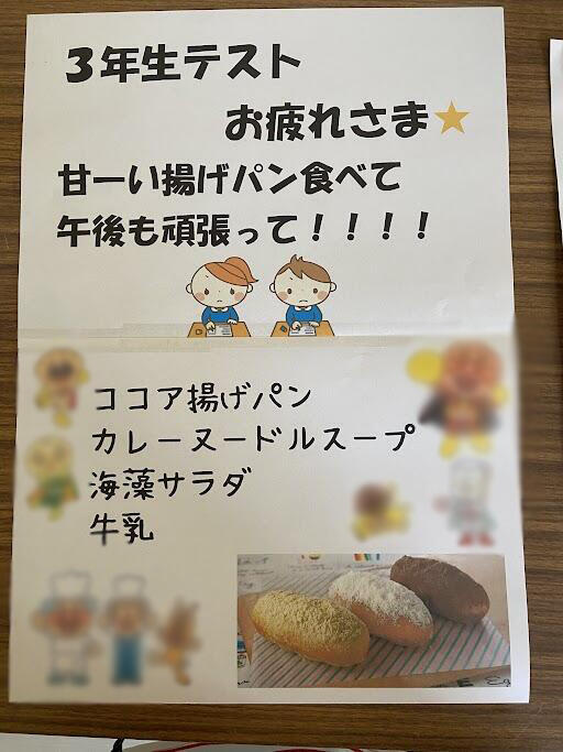 「やったー!ココア揚げパンだー!先生今日はおかわり何個ありますか?!」と配膳しながらウキウキしている2年男子のお当番さん甘いココアがたっぷりついたココア揚げパンは人気のメニューです