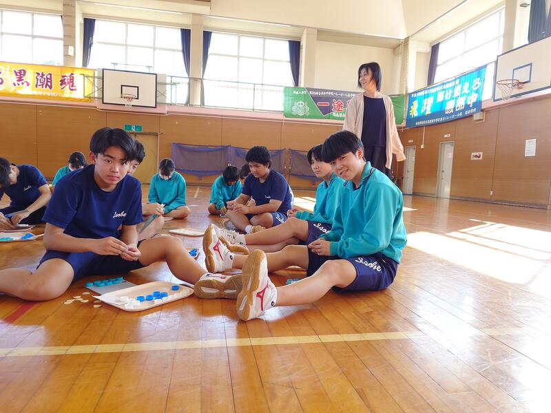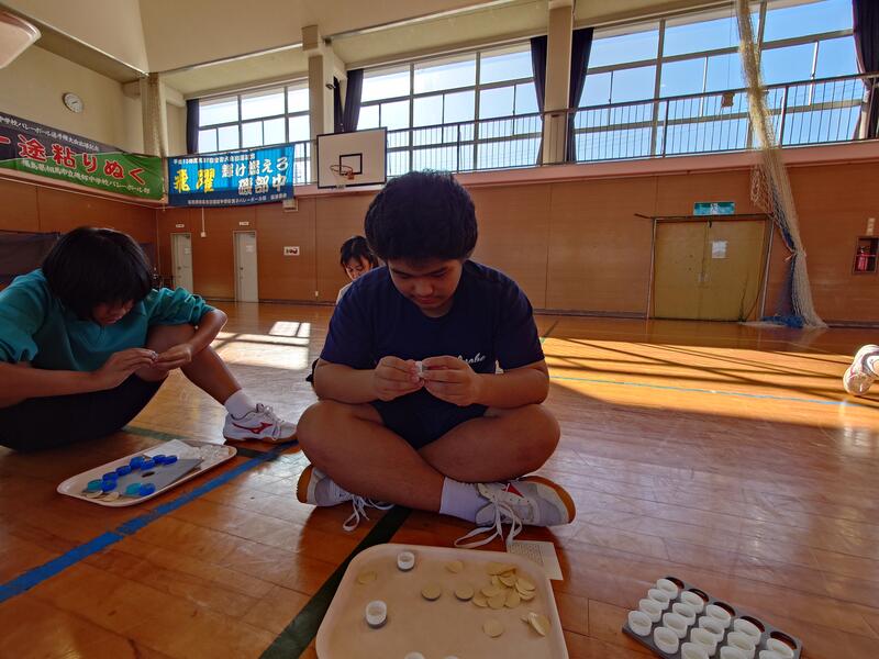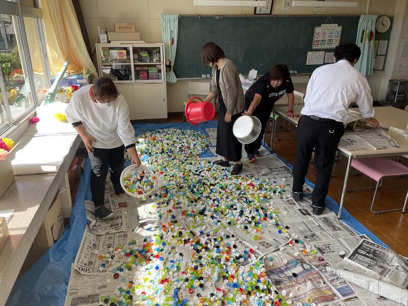 今年度は、地域の方々からご協力いただいて集めている「ペットボトルキャップ」を使った全校アート制作に取り組んでいます。