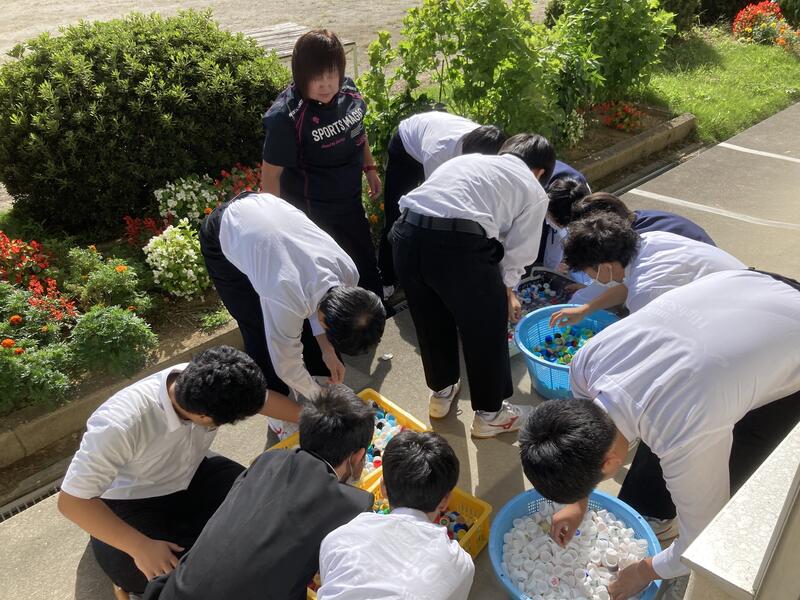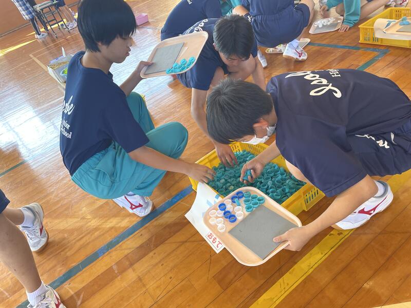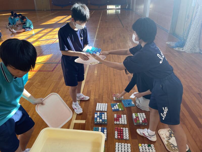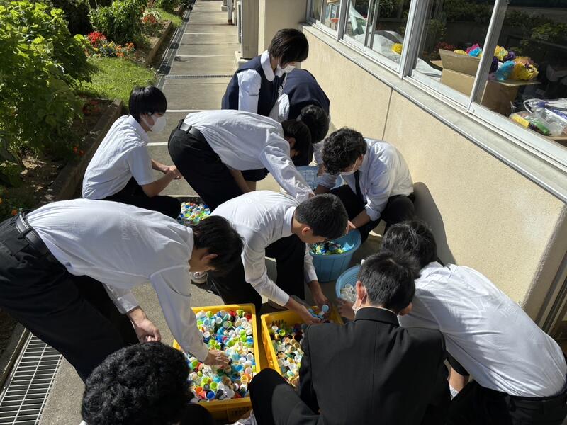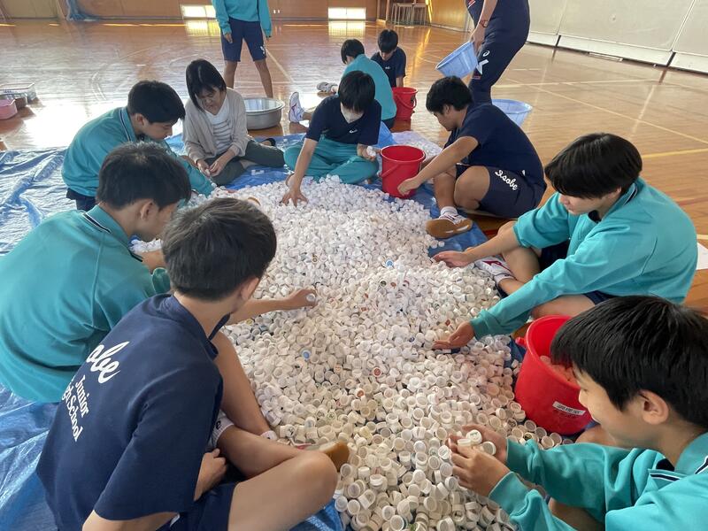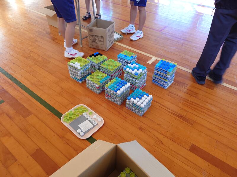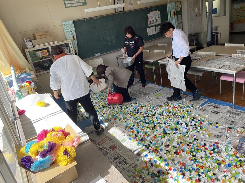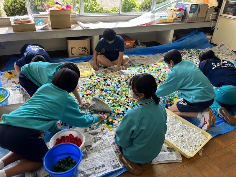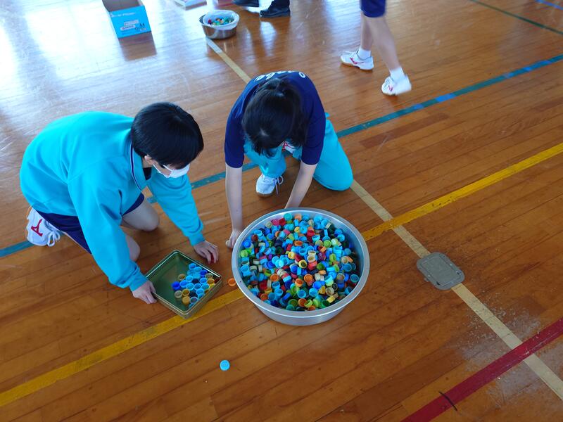 大量のキャップを洗って、色ごとに分けて....。結構な作業ですが、係の子どもたちだけでなく、他の子どもたちや先生方もお手伝いしてくれました。