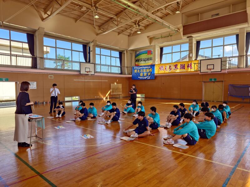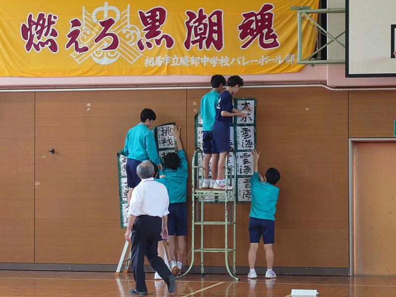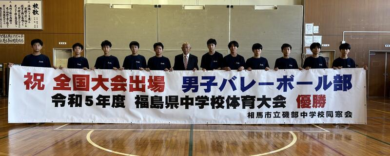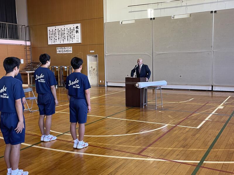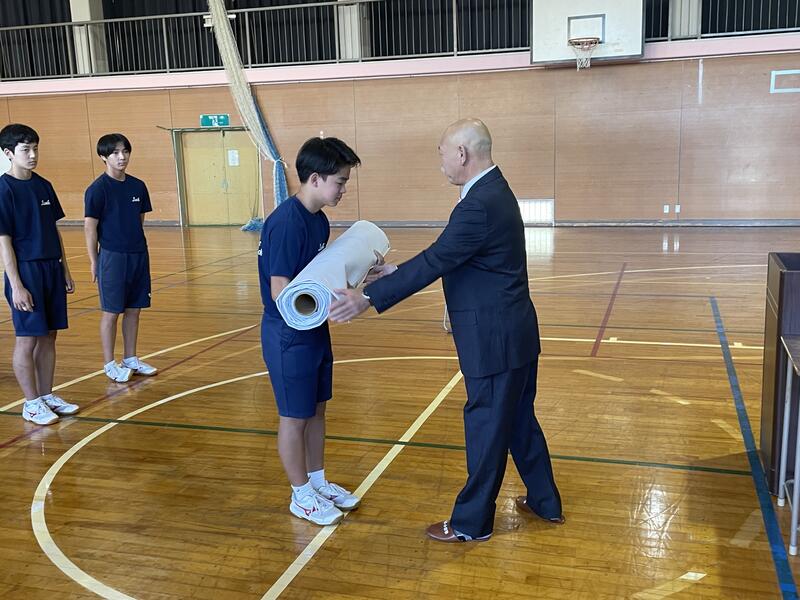 今夏の男子バレーボール部の全国大会出場を讃え、同窓会より横断幕を寄贈していただきました。本日、海川同窓会長さんにお越しいただき、贈呈式を行いました。全国大会出場は一生の財産となること、今後もこの経験を生かして努力をすることなど、お話しいただきました。子どもたちは地域の方々の支えを改めて感じていたようです。