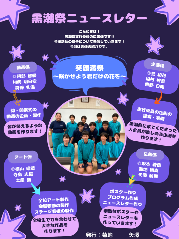 「笑顔満祭 ~咲かせよう君だけの花を~」のテーマの通り、全校生の個性があふれる、「達成感」のある、「思い出」に残る『黒潮祭』になるように子どもたちはがんばっています。