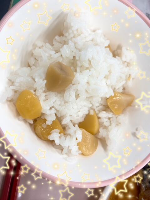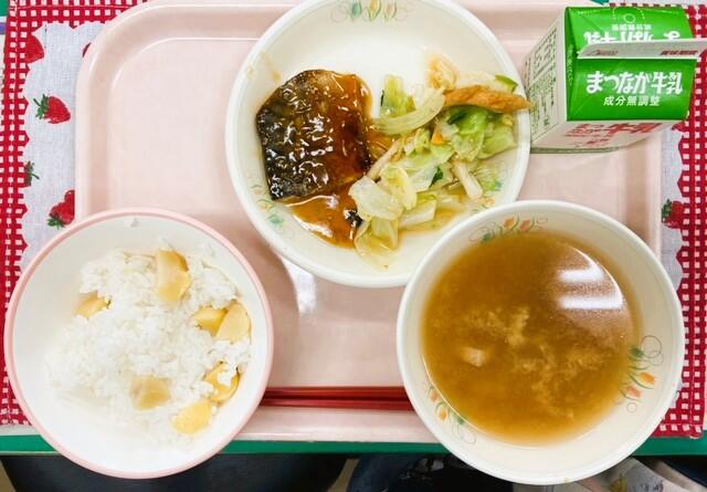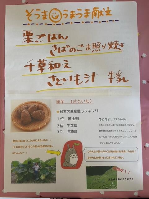 17日 栗ごはん さばのゴマ照り焼き 千草和え 里芋汁 牛乳