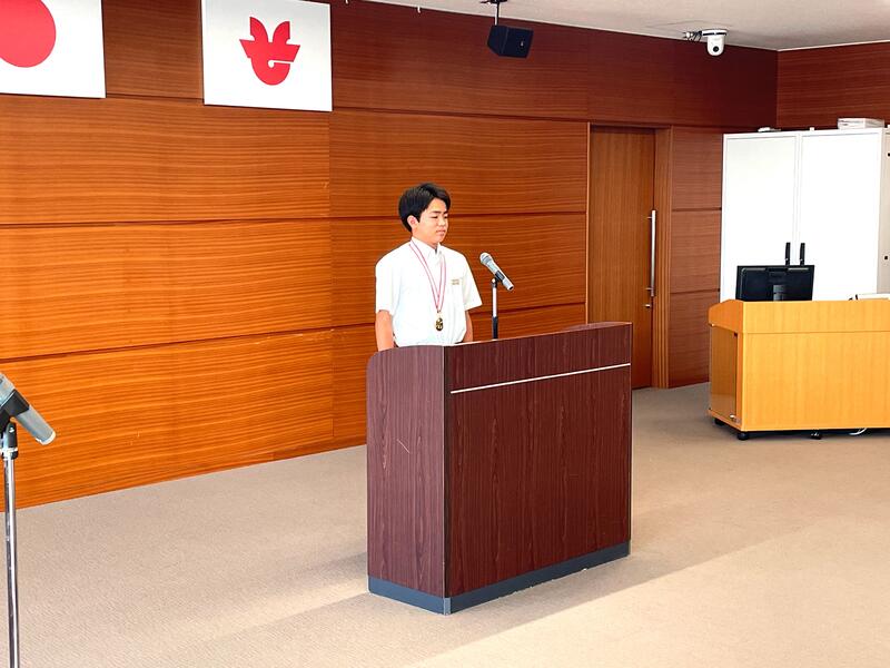 出発に先立ち、相馬市役所で「出場報告会」が開催されました。立谷市長様からは、「胸を張って全国大会で頑張ってください。」と激励の言葉をいただきました。部長の稲村さんからは、「全員で楽しんで、みんなを勇気づけられるようなバレーをしてきたいです。」と決意表明がありました。