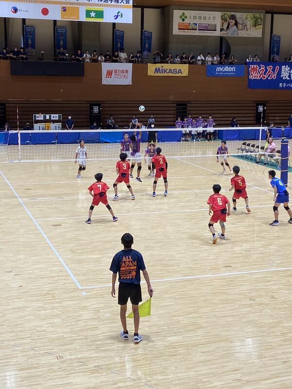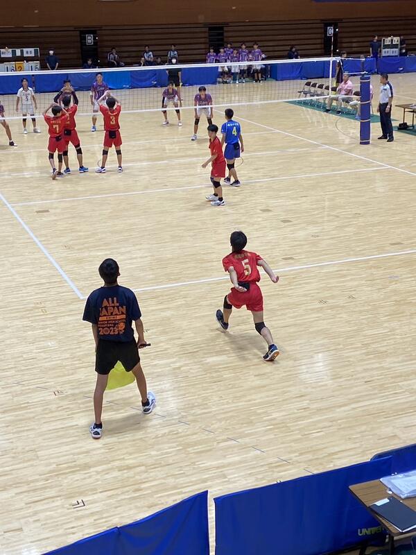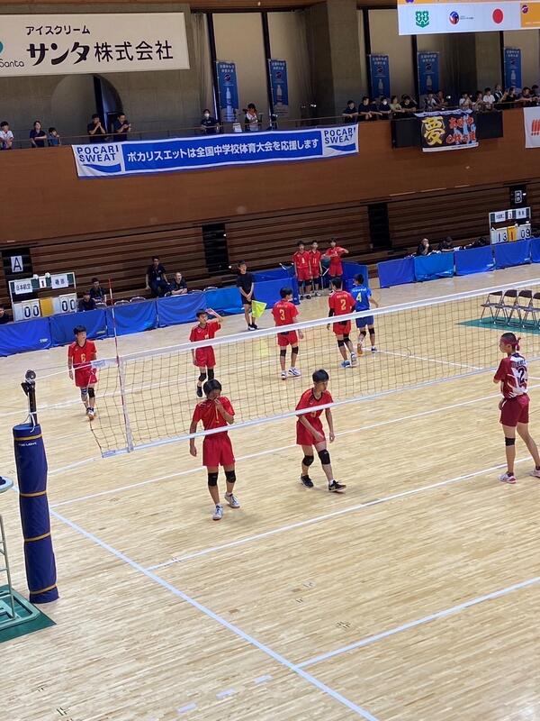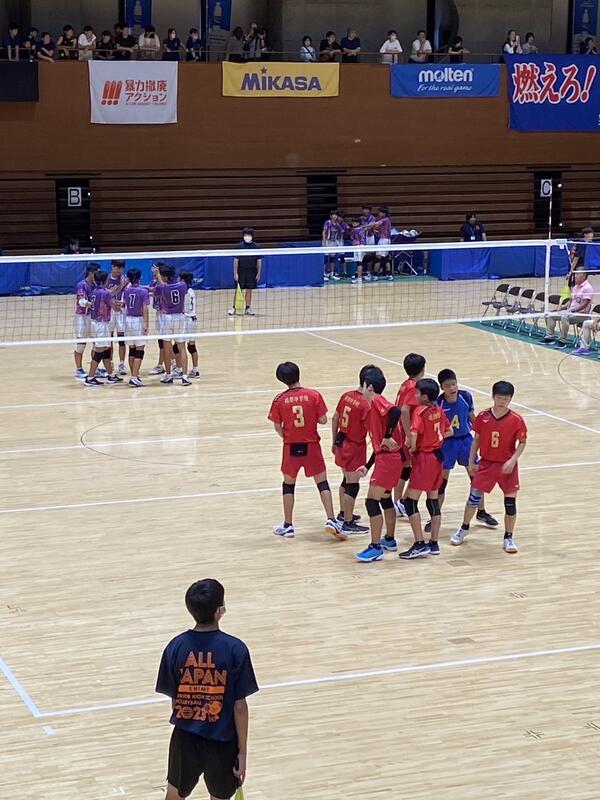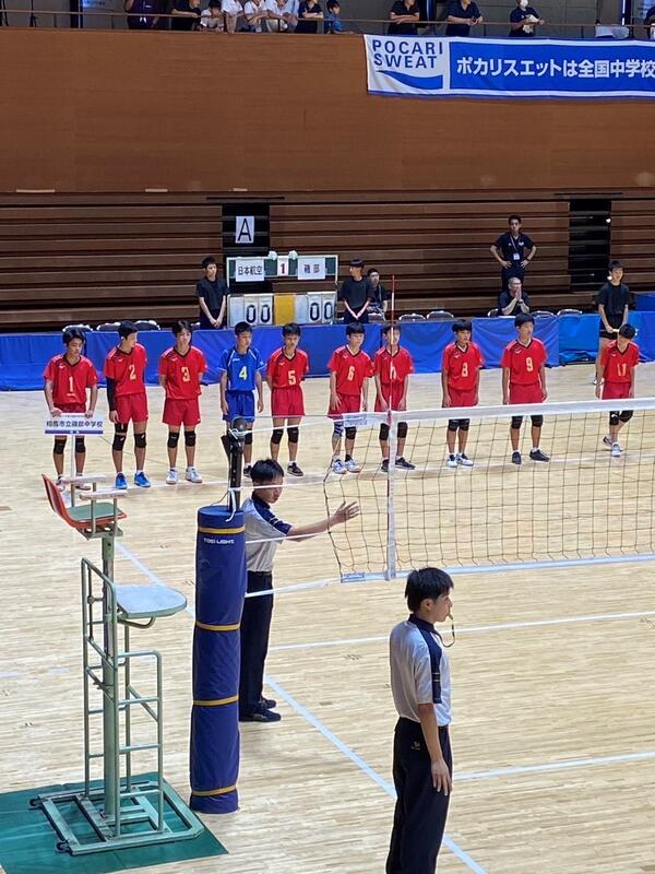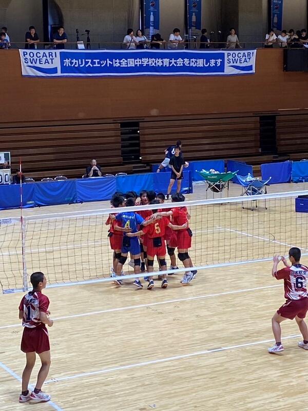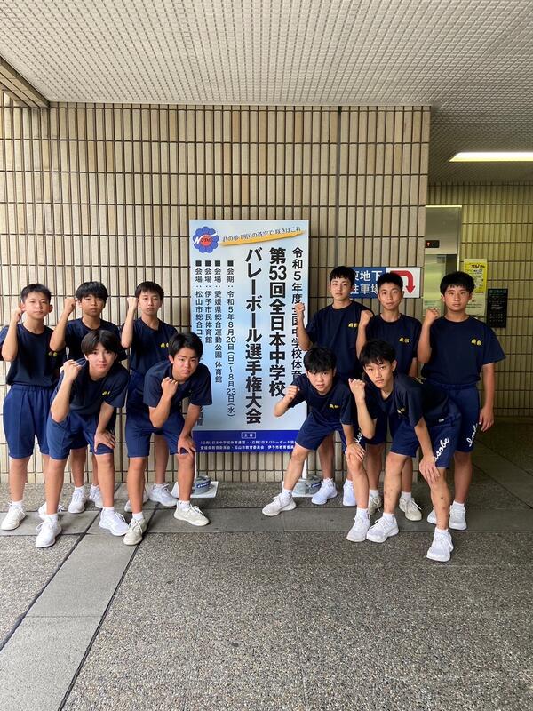 愛媛県松山市で開催されている「令和5年度全国中学校体育大会 第53回全日本中学校バレーボール選手権大会」。 男子バレーボール部が日本航空高等学校附属中学校を2-0で破り、見事予選グループを突破、決勝トーナメントへと駒を進めました。