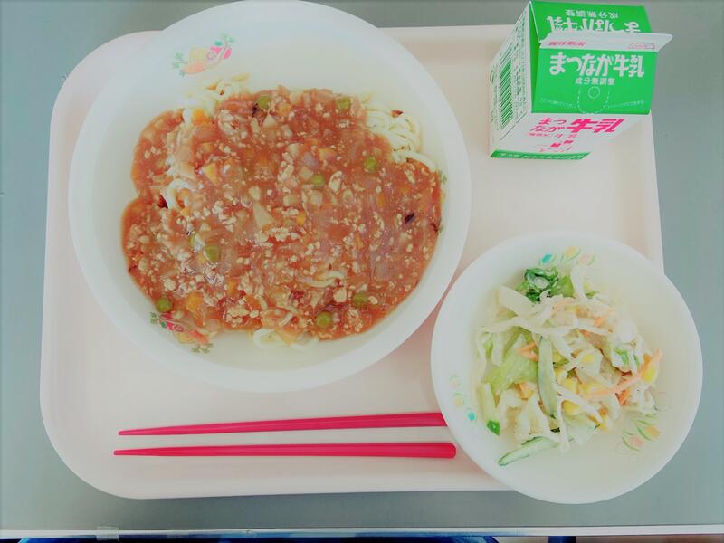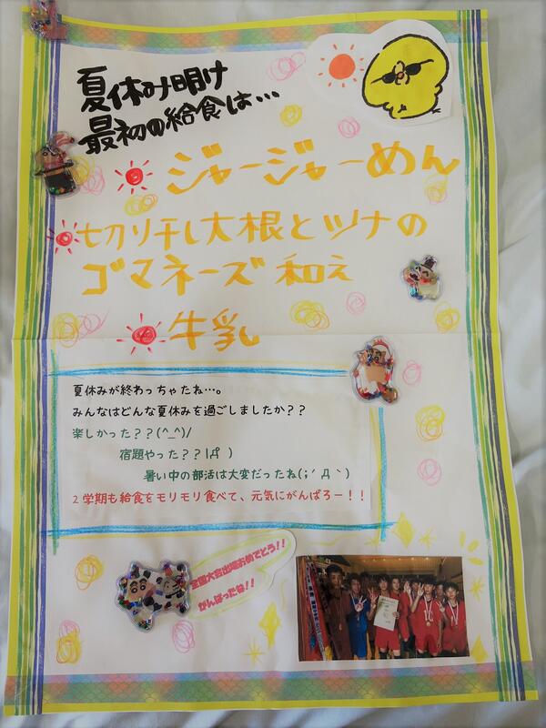 2学期最初の給食はジャージャー麵! そして全国大会が終わり、男子バレー部が1日遅れで登校し、全員が揃いました。久しぶりの給食は…やっぱりおいしいなみんなで食べる給食は楽しいなと改めて実感した給食でした