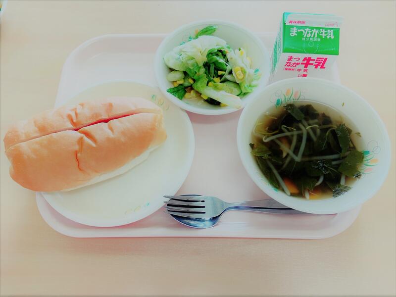 8月24日(木)【カルシウムアップ献立】ウインナードックパン コーンサラダ モロヘイヤスープ 牛乳