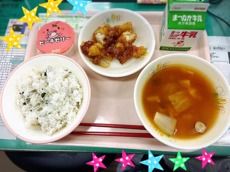 わかめごはん みそかんぷら 夏野菜スープ 牛乳 ピーチゼリー