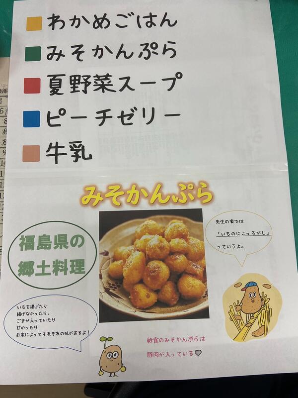 今日も暑い…今日は福島の郷土料理「みそかんぷら」でした。なんだかメニューだけ聞くと地味なメニューだけど、給食のみそかんぷらにはじゃがいもだけでなく、揚げた豚肉が入っていて、結構がっつりメニューです夏野菜スープも野菜たっぷりで、お腹いっぱいですデザートのゼリーはひえひえでありがたい