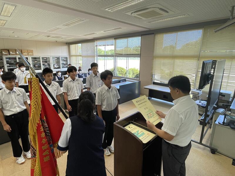 続いて、男子バレーボール部の「県大会優勝」「東北大会準優勝」「優秀団体賞」の表彰伝達を行いました。